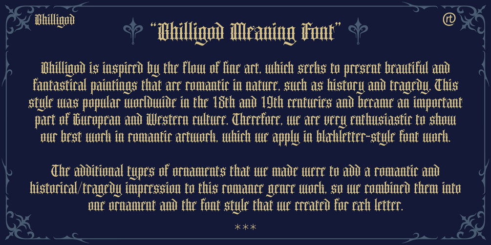 Bhilligod is inspired by the flow of fine art, which seeks to present beautiful and fantastical paintings that are romantic in nature, such as history and tragedy. This style was popular worldwide in the 18th and 19th centuries and became an important part of European and Western culture. Therefore, we are very enthusiastic to show our best work in romantic artwork, which we apply in blackletter-style font work.