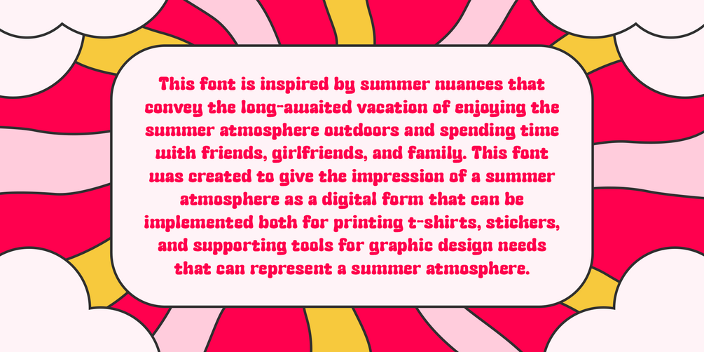 This font was created to give the impression of a summer atmosphere as a digital form that can be implemented both for printing t-shirts, stickers, and supporting tools for graphic design needs that can represent a summer atmosphere.